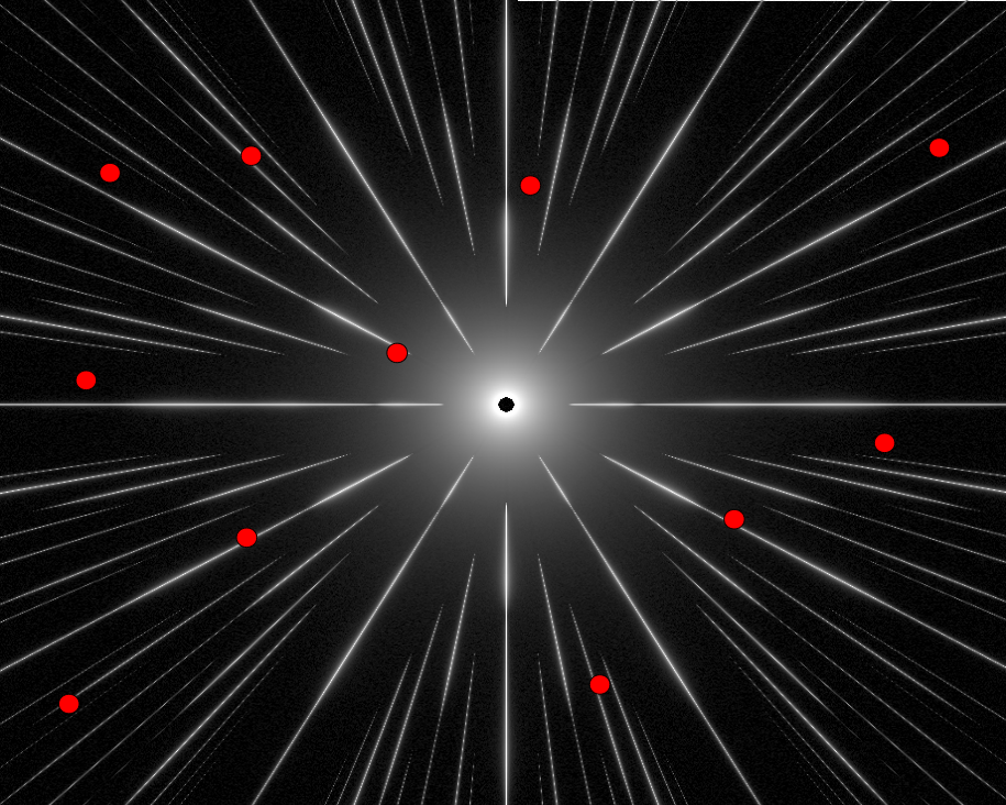 |   | Images of the spikes and the background stars are acquired simultaneously by the focal plane array, while the telescope is slowly rolling. This allows calibration and averaging of astrometric errors down to sub-micro-arcsecond precision.